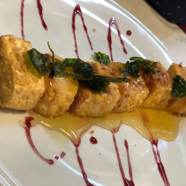 Burrata con base de hojas, miel, frutos secos y compota de manzana.